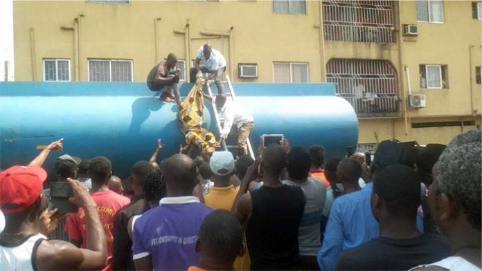 At about 1pm on Monday when our correspondent visited the scene of the incident, the police from the Enerhen Divisional Police Station with the help of sympathisers, were seen evacuating the remains of the victim and the bucket he was allegedly using to scoop fuel from the tanker.